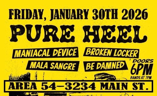 PURE HEEL w/ MANIACAL DEVICE, BROKEN LOCKER, MALA SANGRE, BE DAMNED